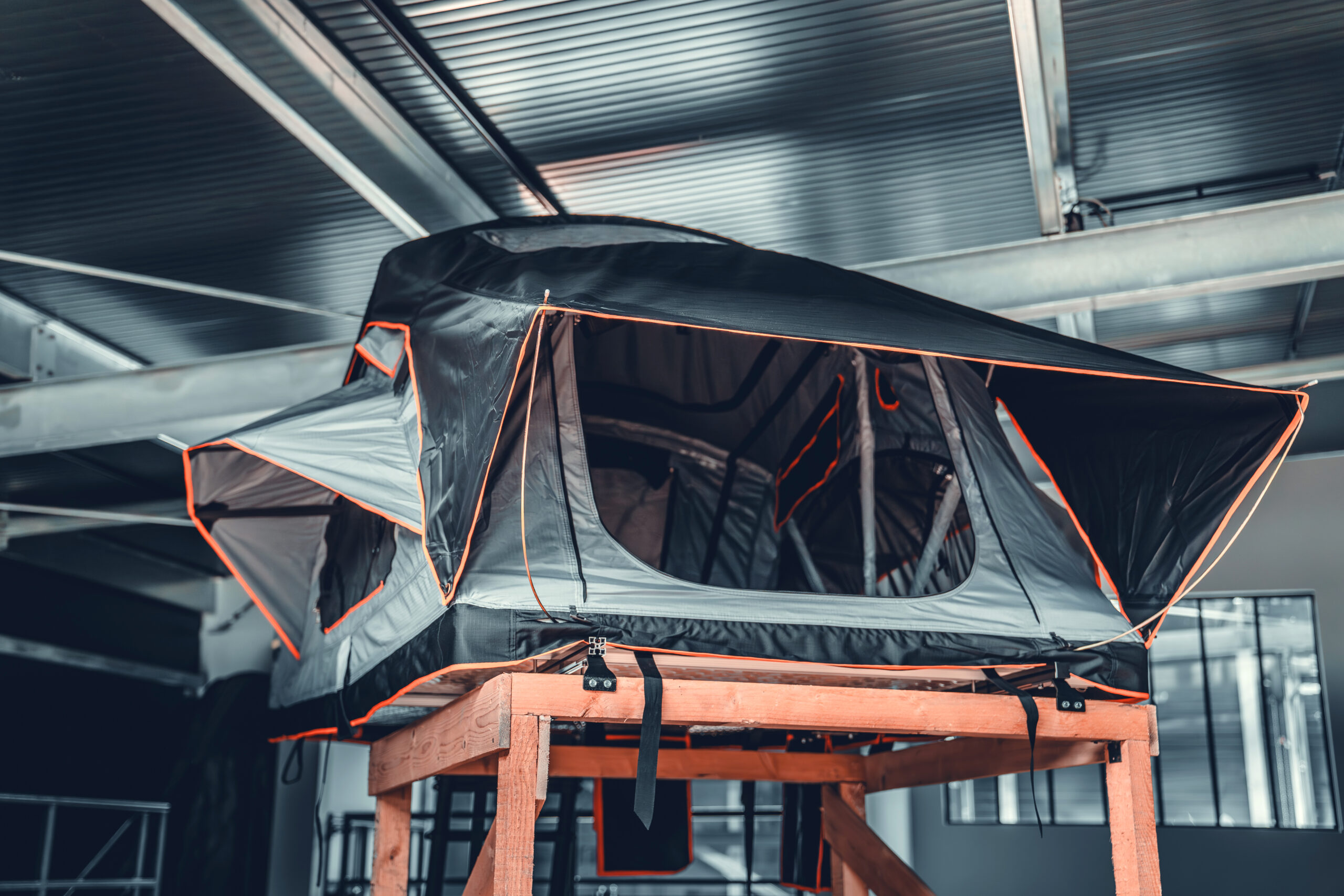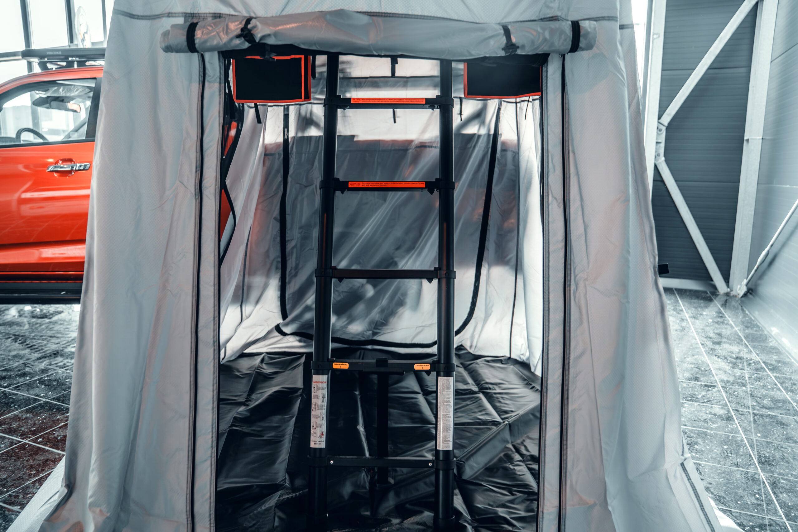 Die Leiter des GEN2 bleibt dabei übrigens komplett im Innenraum, so kann das Vorzelt komplett verschlossen werden. Außerdem hat das Vorzelt einen stabilen Boden, so hältst Du stets Nässe und Dreck von Dir fern. Unser Dachfenster, ein eingebautes Klarsichtfeld von dem aus Du einen direkten Blick auf die Sterne genießen kannst, und unsere serienmäßigen Schuhtaschen runden die Komplettausstattung ab.